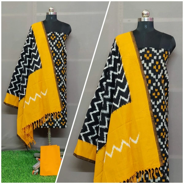 - Fabric - Suit ( Top ) - Cotton, Salwar ( Bottom ) - Cotton, Dupatta - Cotton. This sambalpuri Handloom Salwar Suit Dress Material is made up of Breathable Cotton Ikat to give you immense comfort throughout the day.
