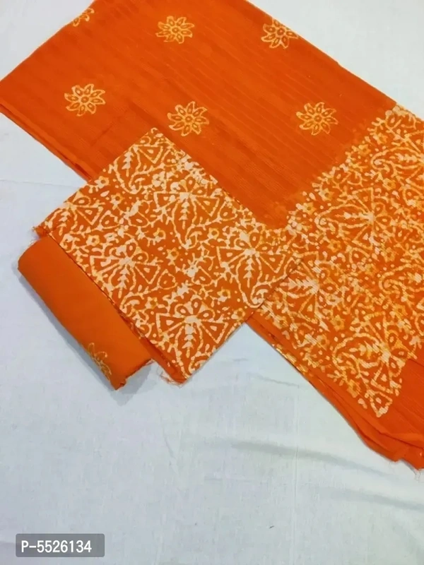 Top Fabric: Cotton, Work- Printed, Top Length: 2.50Mtr, Lining Fabric: Cotton, Bottom Fabric: Cotton, Work- Printed, Bottom Length: 2.25Mtr, Dupatta Fabric: Cotton, Dupatta Length: 2.25Mtr, Type: Un Stitched, Pattern: Printed, Contains- It Has 1 Piece Of Top With Bottom And Dupatta Set For Women,