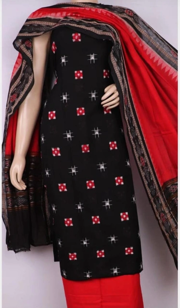 Fabric - Suit ( Top ) - Cotton, Salwar ( Bottom ) - Cotton, Dupatta - Cotton. This Sambalpuri Handloom Salwar Suit Dress Material is made up of Breathable Cotton Ikat to give you immense comfort throughout the day.