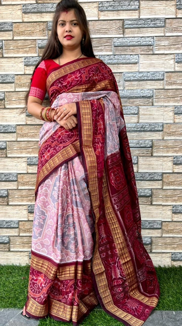 hand-woven fantasy, the Sambalpuri saree is a reflection of its stimulating traditional roots and artistic intricacy. An elegant illustration of the glories of past with contemporary chicness, the Sambalpuri saree will transform any woman into an artist’s muse.The Journey of Sambalpuri: The Saga of an Unending SareeThe story of Sambalpuri weaves is one of mythology and magic. With its roots dipped in the Indian epics and tradition, the Sambalpuri weaves have lasted the test of time owing to the extraordinary craftsmanship of the weavers. It is believed by Padmashree Haldhar Nag, an eminent poet from Odisha that Krishna draped the Sambalpuri around Draupadi, a saree so long that it had no end.Praised for the immaculate artistry, the Sambalpuri makers are dwellers of Orissa. Unique in the making and exquisite in its designs, the Sambalpuri weave reflects an ancient handicraft called BandhaKala. The yarns are tied in accordance with the desired pattern to prevent absorption of dyes in the other areas. It is then dyed with colours that are made by the artisans. The weaves are praised for their vibrant colours and intricate designs, often inspired by the traditional motifs seen occurring at the major temples of Odisha. More recently, the makers are experimenting with the themes and colours for an enhanced contemporary appeal
