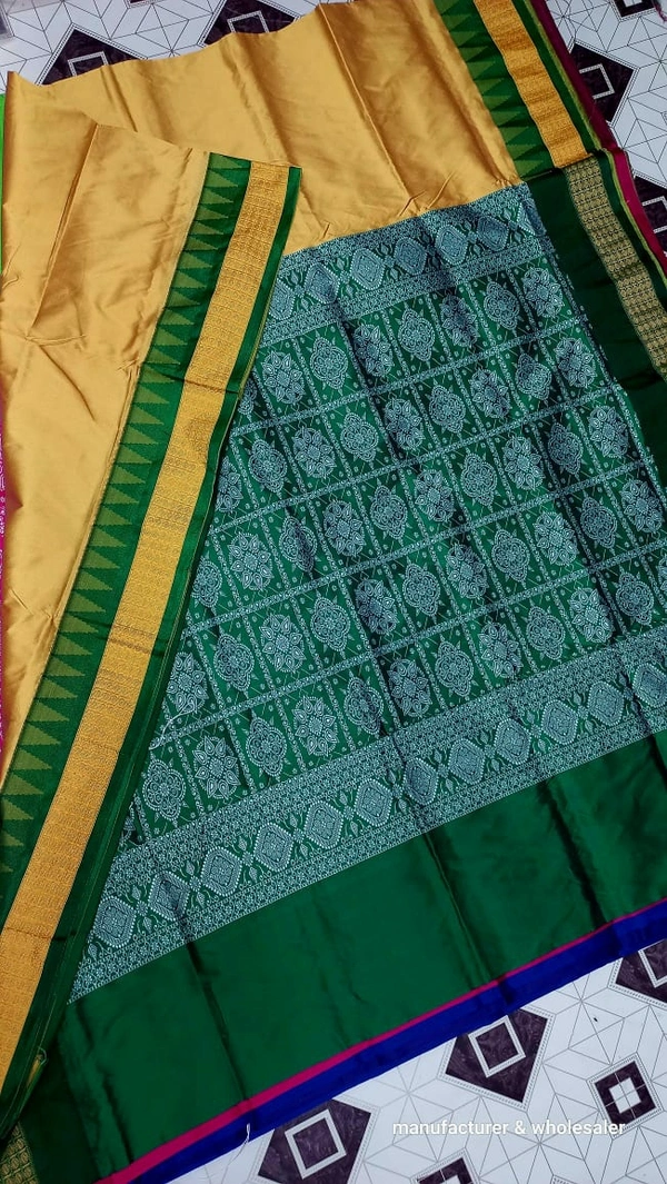 This Silk Saree traditional, With Woven With Handwoven Traditional Silk Saree with stylized floral and geometrical patterns in the borders and contrast colour border and pallu (muhajorha). in Body mix Colour & Pallu ith Blouse Piece.Its has Silk Fabric soft, heavy Zari work border and beautiful design blouse comfortable to wear. Gracefully woven by skilled artisans using high-quality threads and Zari, this saree makes a perfect addition to the wardrobe for all occasionsThis product is made from silk and finished in a attractive green color. It features sambalpuri bomkai weave, and is targeted towards women. Furthermore, it is recommended to be kept away from extreme heat, fire and corrosive liquids to avoid any form of damage....