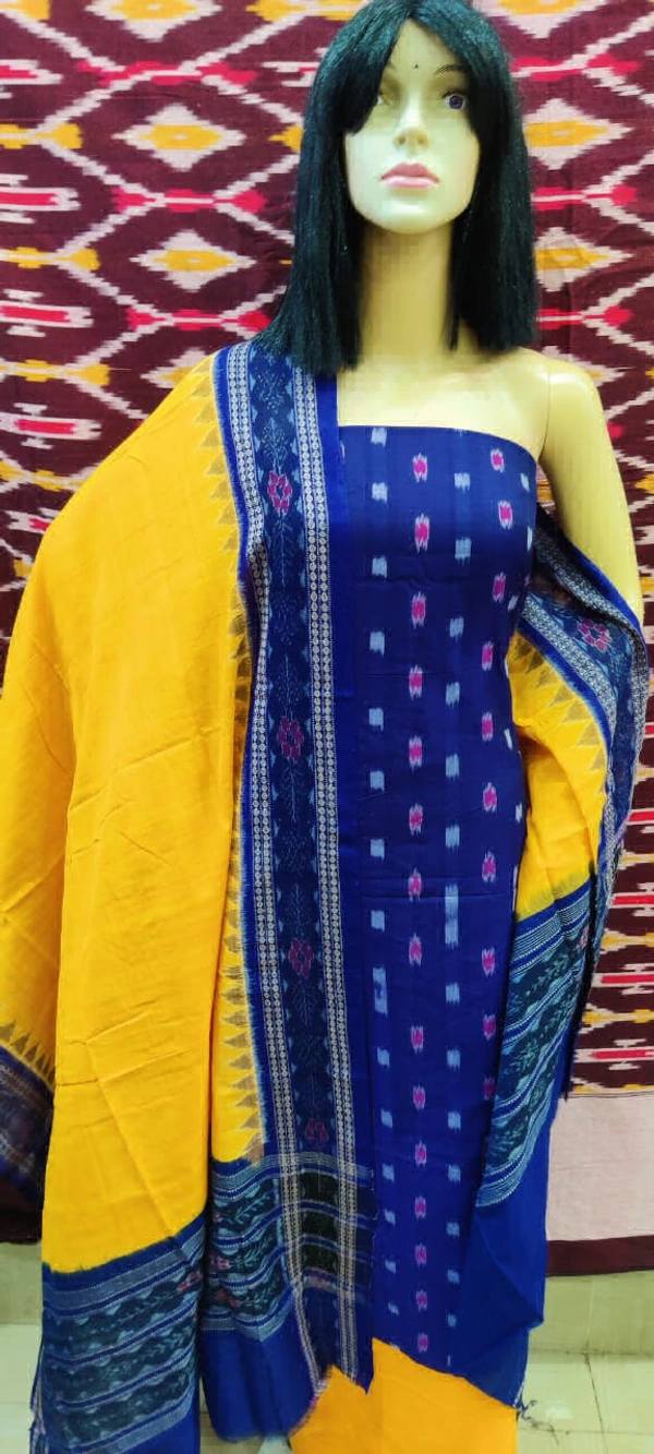 Fabric - Suit ( Top ) - Cotton, Salwar ( Bottom ) - Cotton, Dupatta - Cotton. This Sambalpuri Handloom Salwar Suit Dress Material is made up of Breathable Cotton Ikat to give you immense comfort throughout the day.