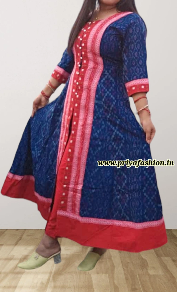 This sambalpuri Round kurti gives a bright look to anyone who wear it... The product has been made by Priya Fashion and given branded stitching & won New Design...Stay stylish with tradition. Sambalpuri kurti is a traditional handwoven garment originating from the Sambalpur region in Odisha, India. These kurtis are known for their vibrant colors and unique ikat patterns created through a tie-dye resist technique. They showcase the rich cultural heritage of the region and are popular for both casual and festive wear...