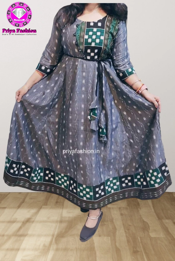 This sambalpuri Round kurti  gives a bright look to anyone who wear it... The product has been made by Priya Fashion and given branded stitching & won New Design...Stay stylish with tradition. Sambalpuri kurti is a traditional handwoven garment originating from the Sambalpur region in Odisha, India. These kurtis are known for their vibrant colors and unique ikat patterns created through a tie-dye resist technique. They showcase the rich cultural heritage of the region and are popular for both casual and festive wear...