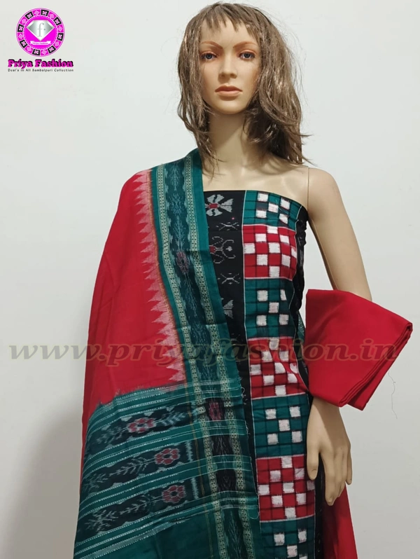 Fabric - Suit ( Top ) - Cotton, Salwar ( Bottom ) - Cotton, Dupatta - Cotton. This Sambalpuri Handloom Salwar Suit Dress Material is made up of Breathable Cotton Ikat to give you immense comfort throughout the day.