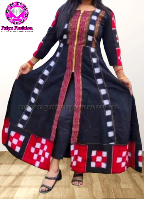 This sambalpuri Round kurti  gives a bright look to anyone who wear it... The product has been made by Priya Fashion and given branded stitching & won New Design...Stay stylish with tradition. Sambalpuri kurti is a traditional handwoven garment originating from the Sambalpur region in Odisha, India. These kurtis are known for their vibrant colors and unique ikat patterns created through a tie-dye resist technique. They showcase the rich cultural heritage of the region and are popular for both casual and festive wear...