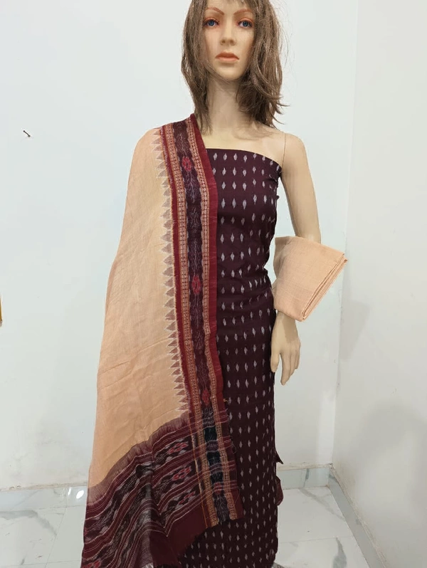 Fabric - Suit ( Top ) - Cotton, Salwar ( Bottom ) - Cotton, Dupatta - Cotton. This Sambalpuri Handloom Salwar Suit Dress Material is made up of Breathable Cotton Ikat to give you immense comfort throughout the day.