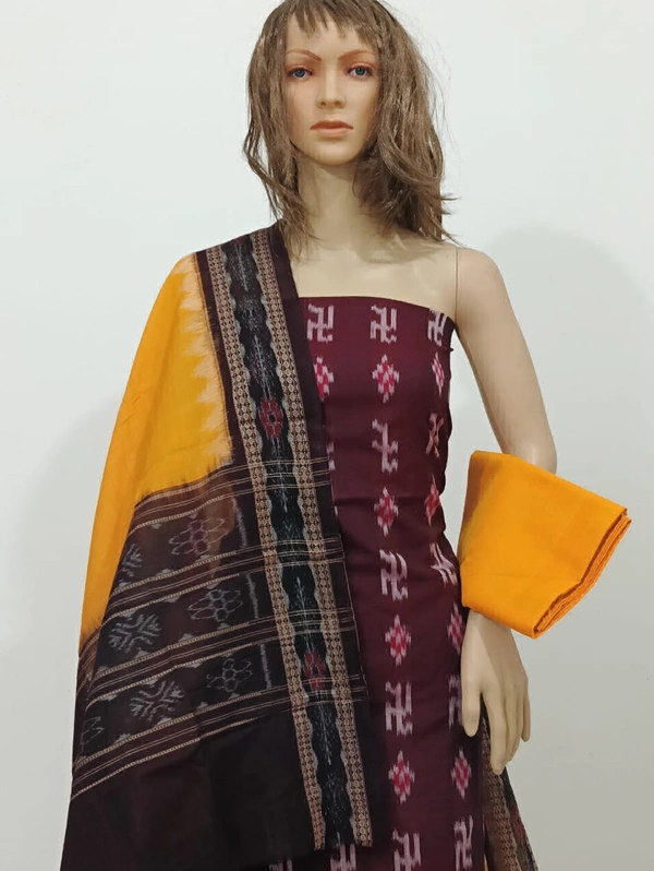 Fabric - Suit ( Top ) - Cotton, Salwar ( Bottom ) - Cotton, Dupatta - Cotton. This Sambalpuri Handloom Salwar Suit Dress Material is made up of Breathable Cotton Ikat to give you immense comfort throughout the day.