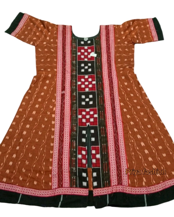 This sambalpuri Round kurti  gives a bright look to anyone who wear it... The product has been made by Priya Fashion and given branded stitching & won New Design...Stay stylish with tradition. Sambalpuri kurti is a traditional handwoven garment originating from the Sambalpur region in Odisha, India. These kurtis are known for their vibrant colors and unique ikat patterns created through a tie-dye resist technique. They showcase the rich cultural heritage of the region and are popular for both casual and festive wear...