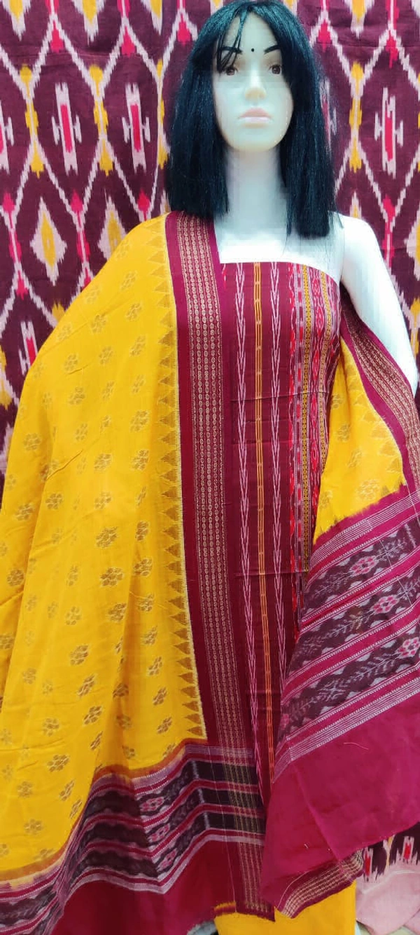 Fabric - Suit ( Top ) - Cotton, Salwar ( Bottom ) - Cotton, Dupatta - Cotton. This Sambalpuri Handloom Salwar Suit Dress Material is made up of Breathable Cotton Ikat to give you immense comfort throughout the day.