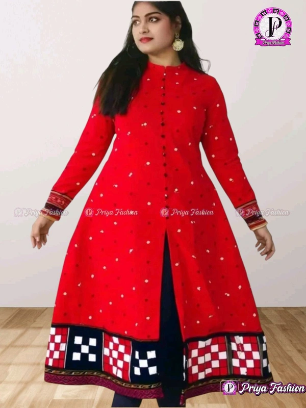 An amazing range of women kurta in soft and solid colors that looks perfect for regular wear. With beautiful designs and patterns. These apparels are very stylish and comfortable too. Get rid of the 'regular' look this season wearing Suit Set by Priya Fashion. With a perfect blend of comfort and traditional style, This Cotton long Round Anarkali Kurti From Priya Fashion embellished with Buttons. Stiching from Priya Fashion Boutique....