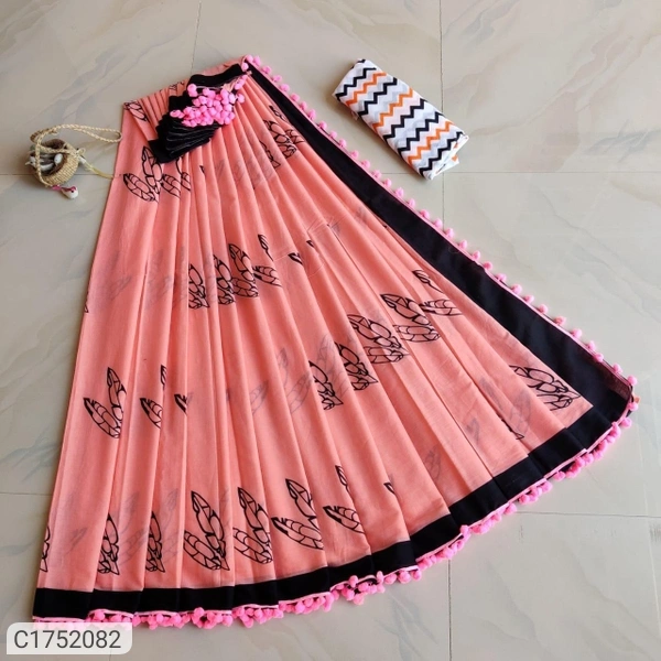 Mulmul Cotton Sarees With Pompom Border Product Name: Special Block Printed Mulmul Cotton Sarees With Pompom BorderPackage Contains: 1 piece of Saree with 1 piece of Blouse piece