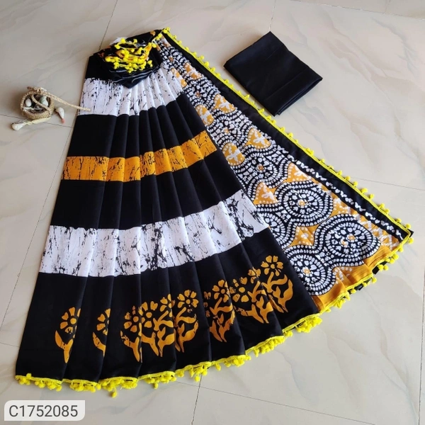 Mulmul Cotton Sarees With Pompom Border Product Name: Special Block Printed Mulmul Cotton Sarees With Pompom BorderPackage Contains: 1 piece of Saree with 1 piece of Blouse piece
