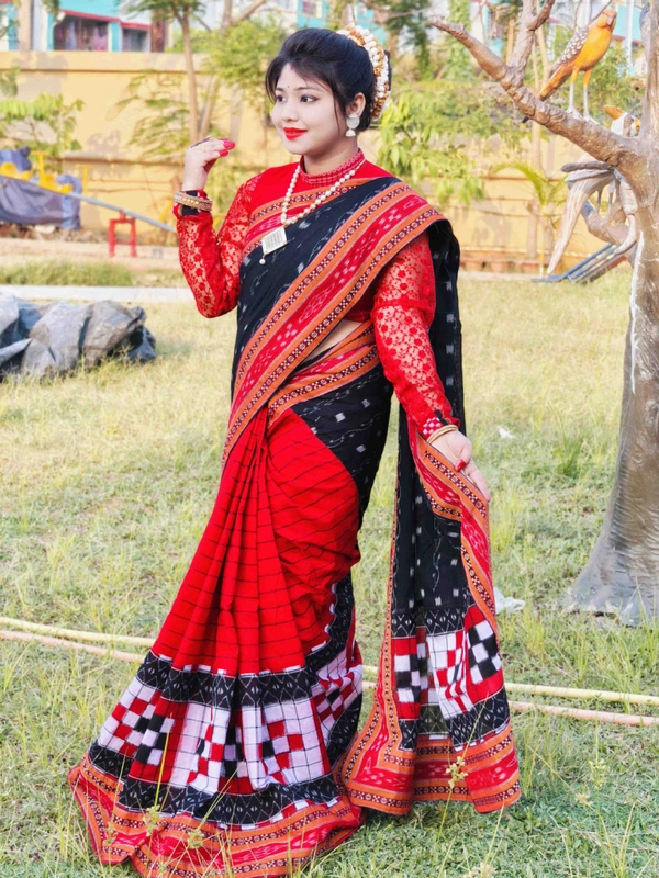 This comfortable Sambalpuri Saree can be worn by women on many different occasions,such as night outs, parties or while travelling, Anniversary💞, marriage party💑, 🫅Birthday party🎂Durga Puja🪔, Nuakhai 🌾🧑🤝🧑,and 💃🕺🎄🎋any 🪔festival function🎎.. & any fastival with special day, pair them with the right bottom wear for a minimal casual look.